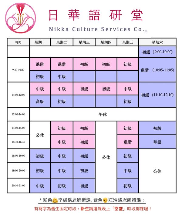 - 原則上每位學生每週固定排一堂課,除非有急迫需求(如:留學、移民、短期加強),每週可排2個時段。